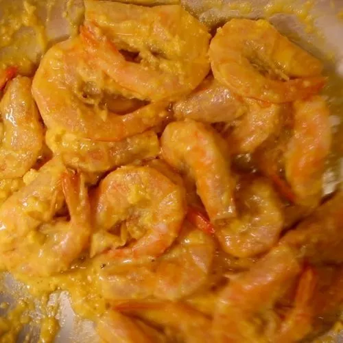 - Bắc chảo, cho 1 muỗng canh bơ thực vật vào đảo đều, tiếp theo cho lòng đỏ của trứng muối vào dầm nát. Cho tiếp 150ml nước dừa vào đánh tan trứng, tiếp theo cho tôm đã chiên vào đảo đều đến khi khô.