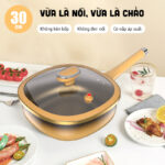 Nồi ngoài dùng để nấu có thể dùng làm chảo chống dính để chiên, tuyệt đối không dính, lớp chống dính bằng công nghệ Titan không bong tróc, không dễ trầy xước dù dùng dụng cụ kim loại. Với kích thước lớn 30cm rộng rãi giúp thoải mái chiên xào các món ăn ngon cho gia đình. Chảo có khả năng chống dính tự nhiên nhờ thiết kế Titanium tinh xảo và trơn tuột, chống dính hoàn hảo.