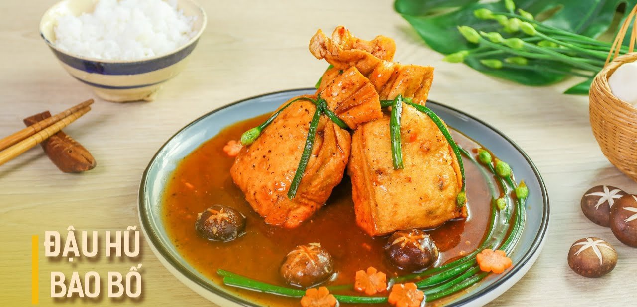 Đậu hũ bao bố, món ăn đẹp mắt lại vô cùng thích hợp cho những ngày rằm thanh tịnh. Từng cái “bao bố” nhỏ xinh. tròn tròn lại vàng ươm được làm từ đậu hũ rất sáng tạo. Bên trong là các loại nấm trộn lẫn hấp dẫn cùng nước sốt với hương vị thanh nhẹ. Hãy bổ sung ngay vào thực đơn chay của gia đình bạn nhé!