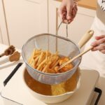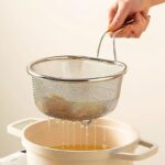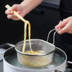 Lưới inox dày dặn, mắt lưới đều và nhỏ, giúp thoát nước, thoát dầu nhanh chóng. Đồng thời giữ được thực phẩm bên trong, không bị lọt ra ngoài khi luộc mì, trần rau hoặc chiên rán.