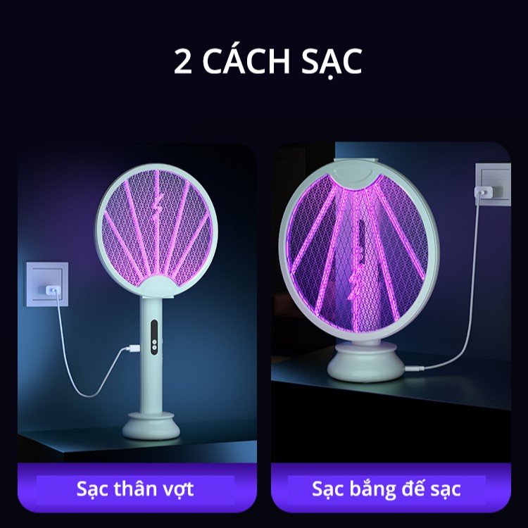 - 4 trong 1 tiện dụng: Vợt muỗi điện + Đèn bắt muỗi tia UV + Treo tường + Gấp gọn để bàn.