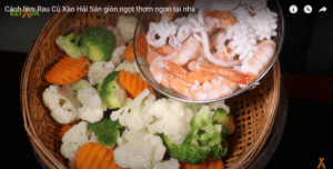 Cho 1,5l nước lọc vào nồi, thêm 1 muỗng canh dầu ăn rồi đun nước sôi già thì cho rau củ vào luộc 5 phút sau đó vớt ra để ráo.Cho tiếp tôm mực vào trụng sơ rồi vớt ra.