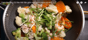Cho rau củ luộc và phần sốt xào còn lại vào chảo, đảo đều tất cả với lửa lớn khoảng 2-3 phút rồi thêm hành lá xắt khúc và tắt bếp.