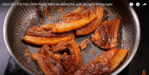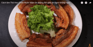 Cho dầu ăn vào chảo xăm xấp sao cho ngập ½ miếng thịt rồi đun nóng, dầu nóng cho 1 muỗng canh bột bắp vào nấu sôi dầu. Dầu sôi cho thịt vào chiên lửa nhỏ đến khi thịt vừa vàng thì tăng lửa lớn chiên cho da phồng thịt giòn rồi tắt bếp, gắp thịt ra.