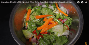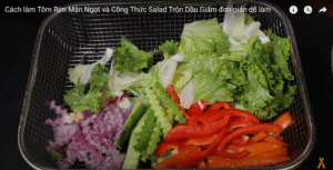 Cho vào thố rau xà lách, ớt chuông, cà rốt, dưa leo, hành tây tím rồi cho sốt dầu giấm đã để nguội vào trộn đều nhẹ tay đến khi vừa ý.